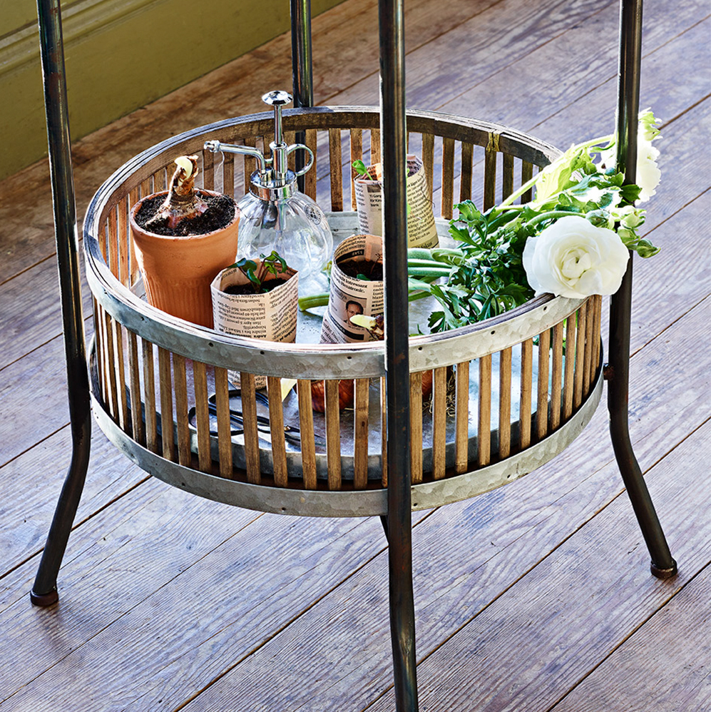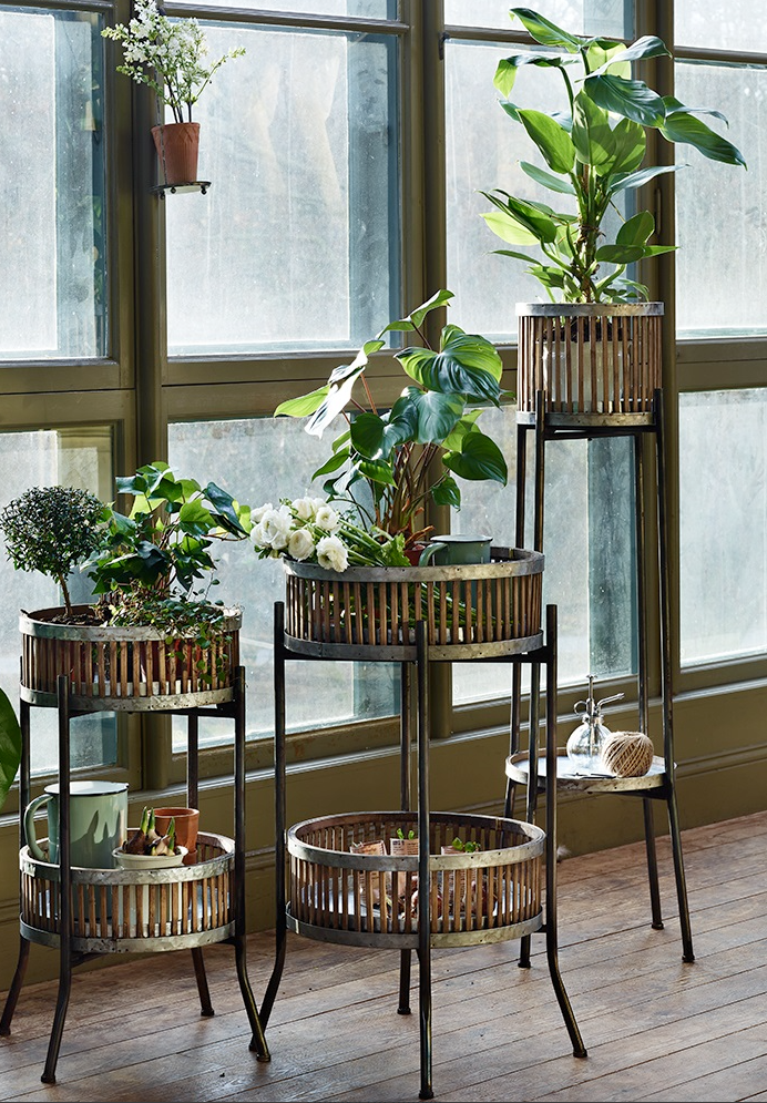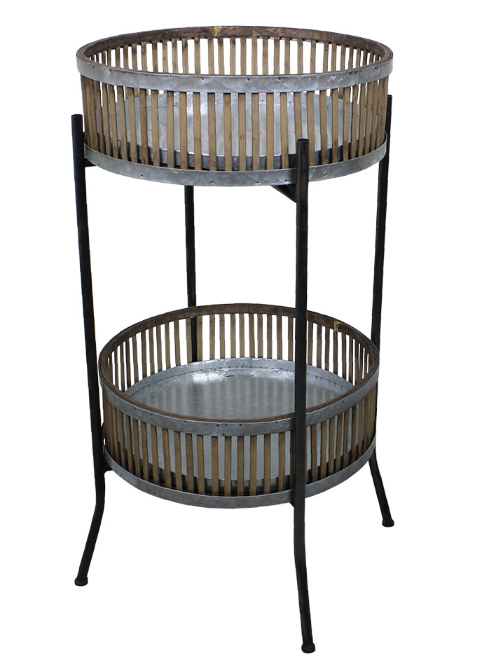 Stativ med to kurver, perfekt for planter og dekorasjoner eller som avlastningsbord. Stativ i svart metall, hyller og kurv i bambus og galvanisert metall, med en bunn som består av en solid treplate i kryssfiner.